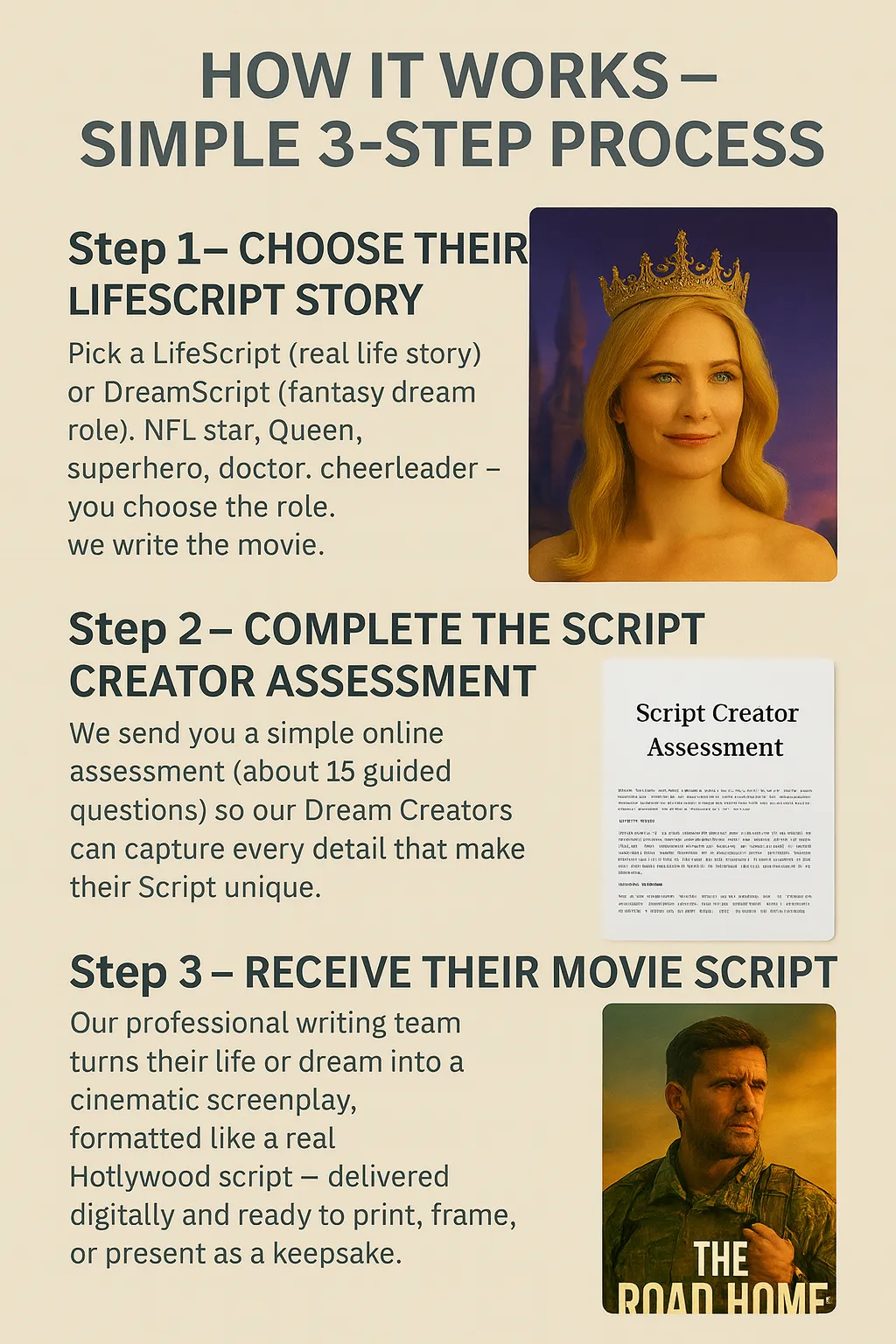 From NFL draft picks to queens, superheroes, and success stories – LifeScripts creates a personalized screenplay that makes your child, spouse, or loved one the star of their own movie.